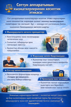 Бул принциптерди сактоо кызматтык милдет гана эмес, сот аппаратынын ар бир кызматкеринин адеп-ахлактык парзы болуп саналат. Бул ачыктыкты, айкындуулукту жана жарандардын сот адилеттигине болгон ишенимин бекемдөөгө карай маанилүү кадам.